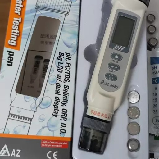 PH متر AZ 8685 ساخت کشور تایوان دستگاهی دیجیتال برای اندازه گیری مقدار PH مایعات در محدوده اندازه گیری ۰ تا ۱۴ PH با دقت اندازه گیری +/-۰٫1 می باشد . این PH متر به صورت قلمی طراحی و ساخته شده و برای اندازه گیری و کنترل تست کیفیت آب بسیار مناسب می باشد . با استفاده از این PH متر قلمی می توان علاوه بر اندازه گیری مقدار PH ، درجه حرارت را نیز در محدوده ۰ تا ۶۰٫۰ درجه سانتی گراد اندازه گیری کرد . از دیگر ویژگی این مدل PH متر قلمی می توان به صفحه نمایش LCD بزرگ دو خطی برای نمایش مقدار PH و همچنین دما ، امکان کالیبراسیون خودکار بسیار راحت فقط با یک دکمه با ۳ نقطه کالیبراسیون و همچنین استاندارد حفاظتی IP65 که حفاظت در برابر نفوذ گرد و غبار و افشاندن آب بر روی دستگاه را تضمین می کند ، اشاره کرد .